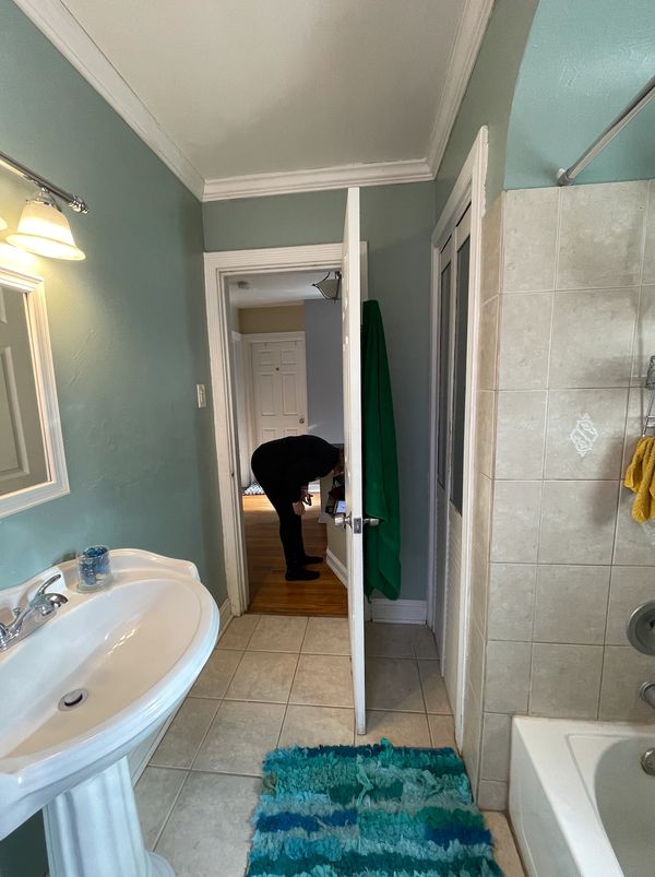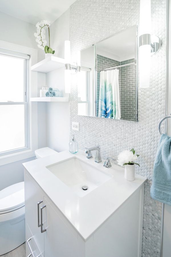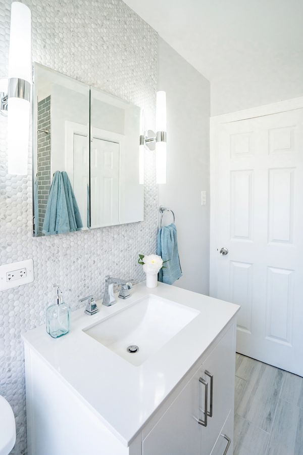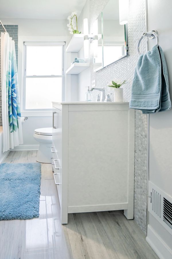 Our client was looking to update her hall bathroom with a fresh and modern spa like feel. We started by opening up the shower area to create a larger and brighter space. We added warm grays and soft blue hues to create the spa like feel. A beautiful penny tile accent behind the crisp white vanity gave the finishing touch to this elegant new bathroom. Our client couldn't be happier with her new bathroom!